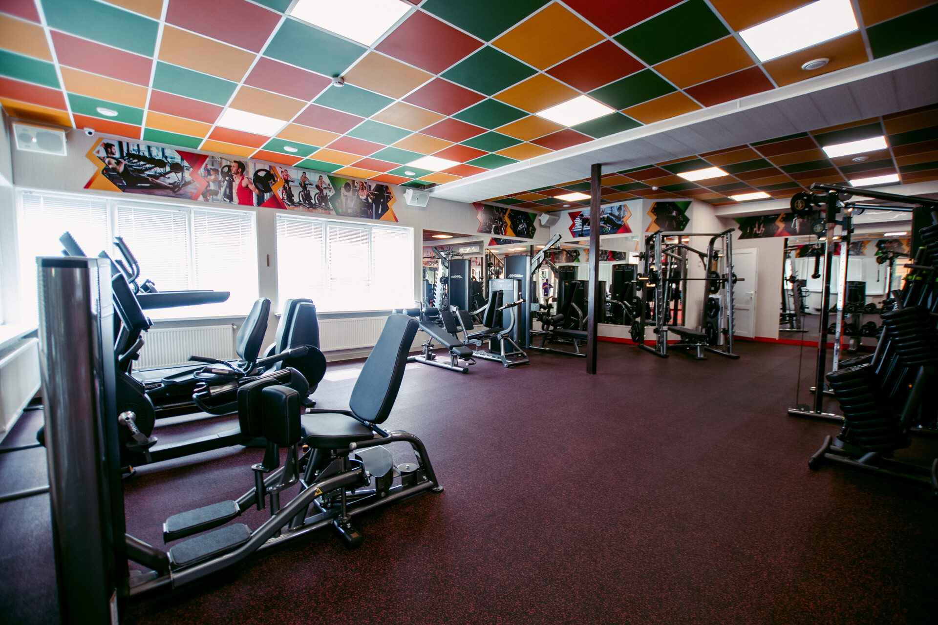 Зал групповых занятий с зеркалами и большим выбором аэробных снарядов